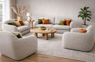 Sala residencial a base de mimbre tejido artesanalmente en forma V, cojines de lino, 3 plazas, loveseat, y sillon de 1 plaza.