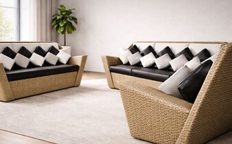 Sala residencial a base de mimbre tejido artesanalmente en forma V, cojines de lino, 3 plazas, loveseat, y sillon de 1 plaza.